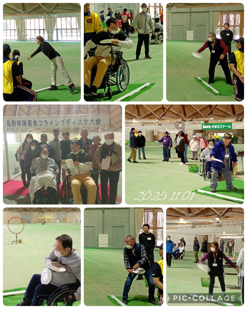 秋晴れとなった11月1日(土)、松本の「やまびこドーム」で行われた「長野県障がい者フライングディスク大会」に、御代田町身体障がい者福祉協会の有志で出場してきました。