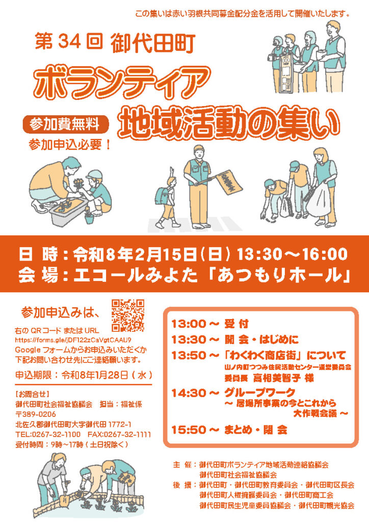 毎年開催している「御代田町ボランティア地域活動の集い」ですが、今年度は当初2月8日の開催予定でしたが選挙が入ったため急遽2月15日(日)の開催となりました。