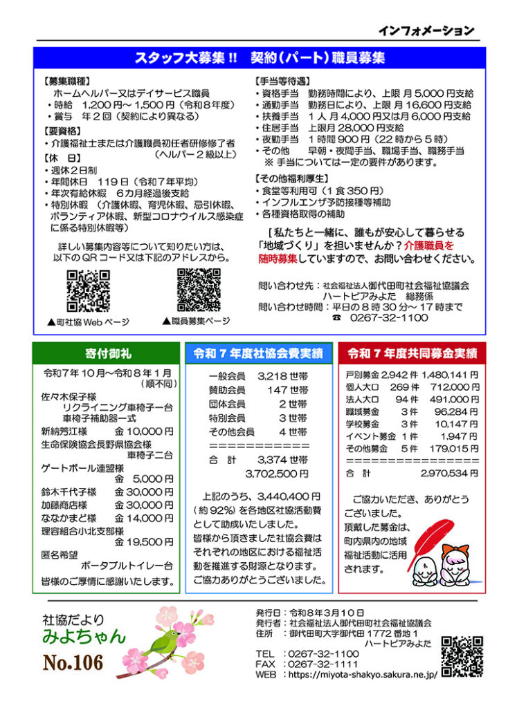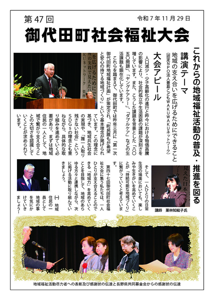 社協広報誌「みよちゃん」では、御代田町社協が行っている事業の紹介や事業報告、イベントのお知らせ、特集記事などを掲載しています。