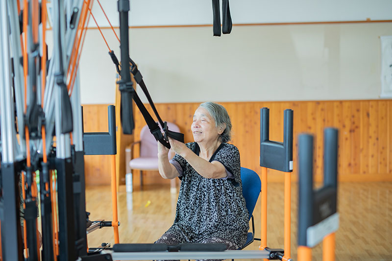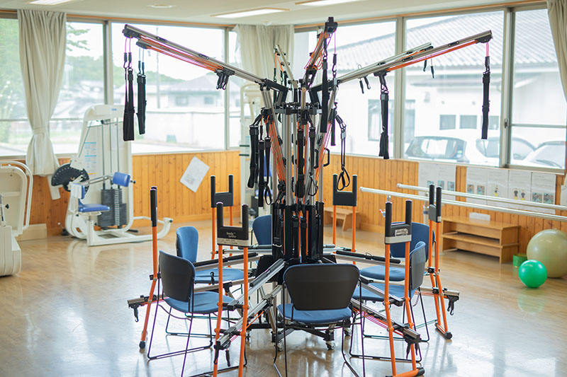 当施設はリハビリ機器が豊富で、誰でも手軽にトレーニングができる「ボディ・スパイダー」1台や本格的なリハビリマシーン「パワーリハビリ機器」各4代を設置しており、スタッフの指導のもと皆さん一生懸命にリハビリを取り組んでおります。