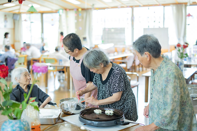 春には花見のドライブ、夏には夏祭り、秋には紅葉のドライブ、冬には初詣など、施設内だけではなく、ふだん外出する機会が少なくなった利用者様に四季を感じて頂きたく、外出でのレクレーションも実施しております。施設内では、集団体操やおやつ作り、カラオケなど多種多様なレクレーションを用意しております。