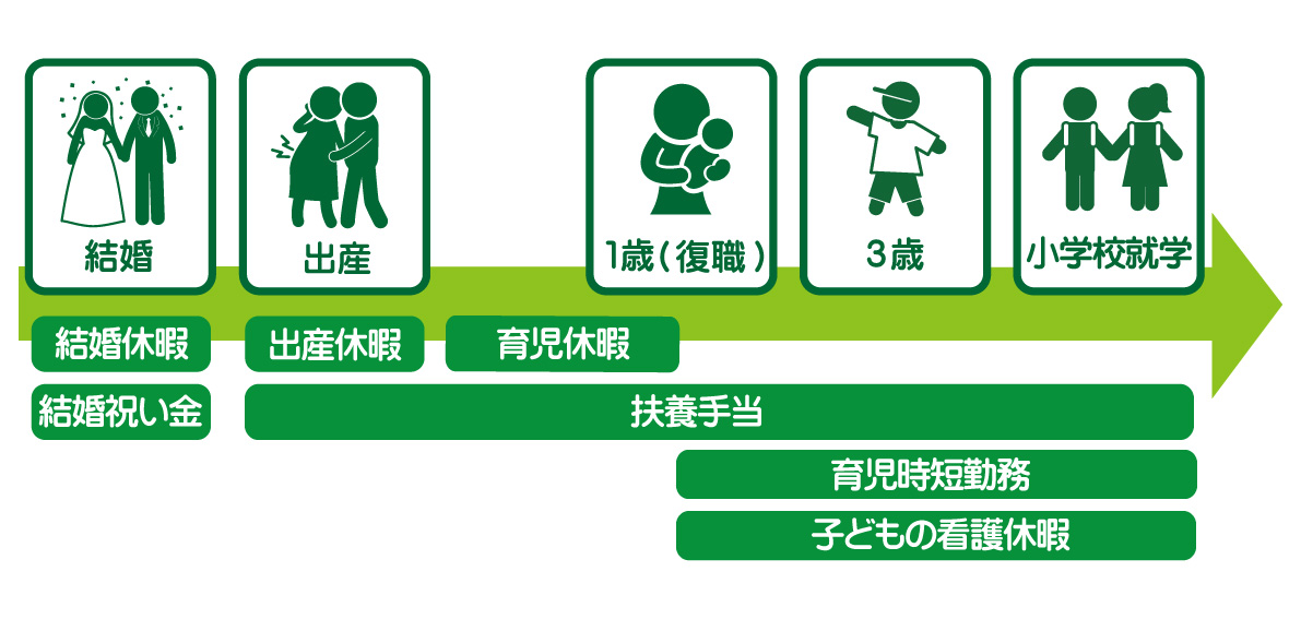 | 休暇 | 介護休暇、育児休暇、結婚休暇、母子保健休暇、配偶者出産休暇、忌引休暇、災害等休暇、子の看護休暇、ボランティア休暇、裁判員休暇 |