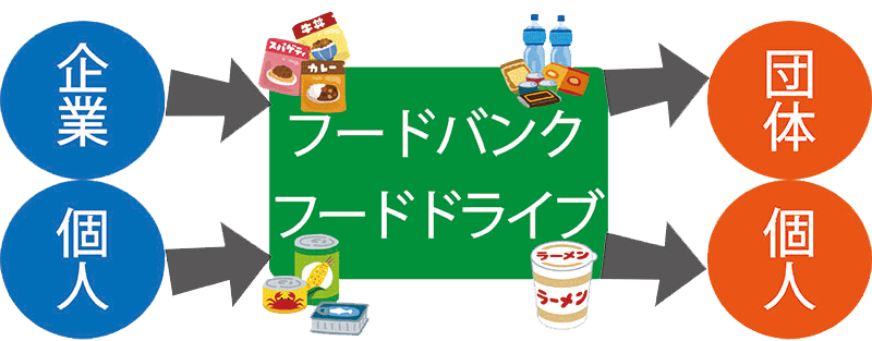 「フードドライブ」とは、この活動の中でも、地域住民との連携を図り広く一般家庭からも食品の提供を呼び掛けそれを必要としている施設や世帯に供給していく、地域で問題を解決していく活動です。「ドライブ」は活動や運動という意味で、food(たべもの)drive(運動)で、「食べ物を集める運動」という意味になります。フードドライブは各地域のフードバンク団体が行政窓口や公共施設、NPO法人、社会福祉協議会などの事務所に食品の回収BOXを設置し、実施しています。